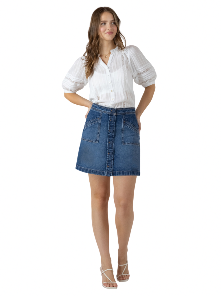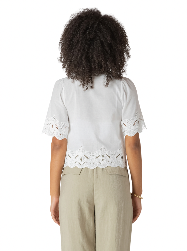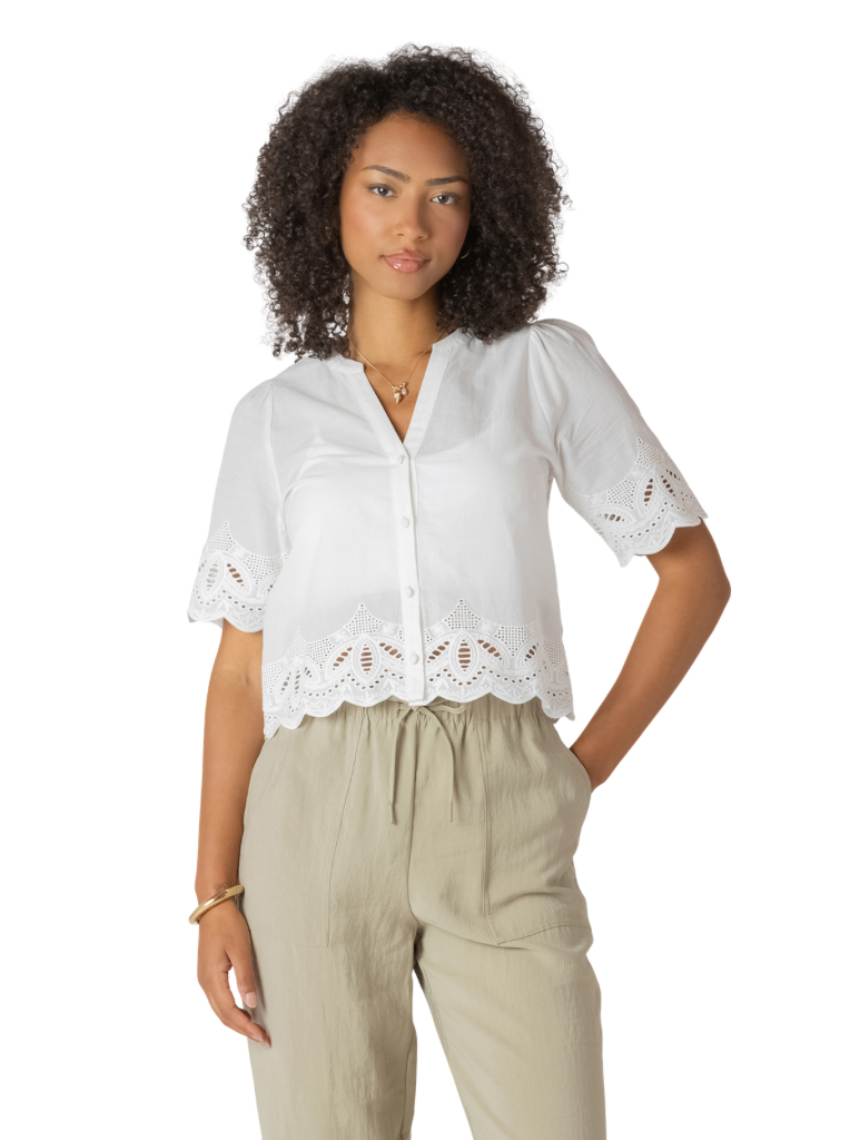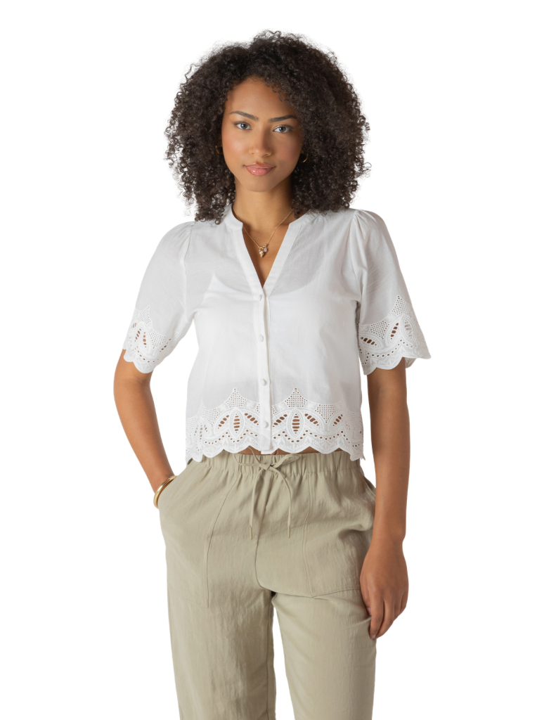 A 100% cotton short sleeved shirt with buttons, embroidery, and eyelet details! An elevated take on an everyday essential. Super cute worn alone as a blouse or as a layering piece over a tank top or swimwear in the summer!