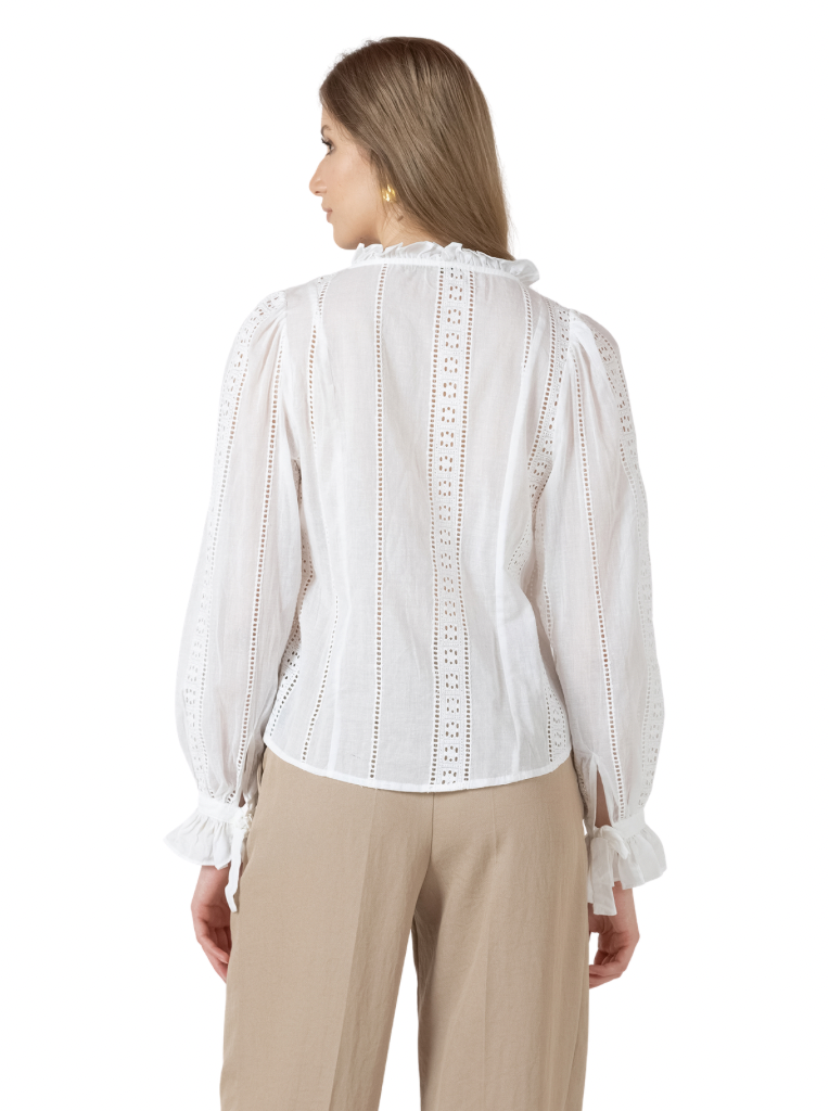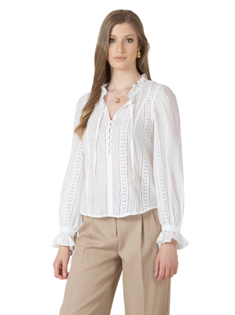 Lightweight and breezy, perfect for spring and summer. This 100% cotton eyelet detail top has bishop sleeves, ruffle details, and button and tie details at the neckline.