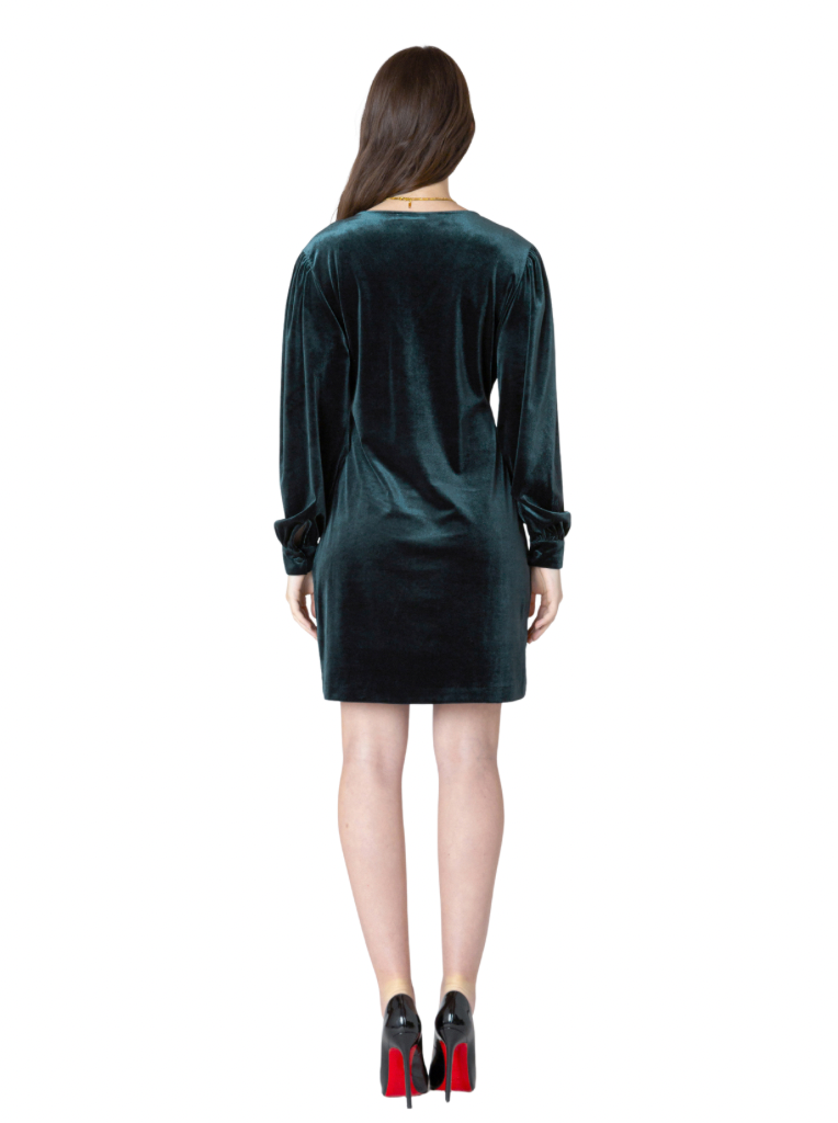 A beautiful jewel toned velvet dress with bishop sleeves and v-neckline. Perfect for holiday season events!