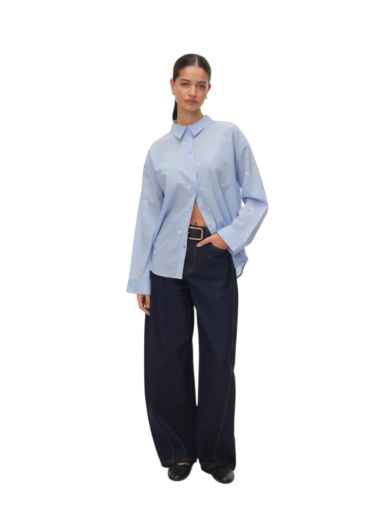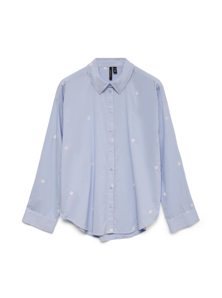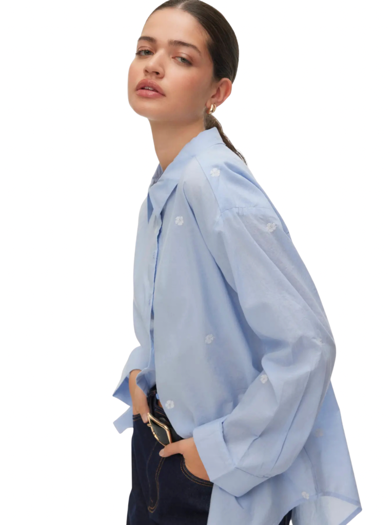 An oversized, collared button-up shirt with tiny floral embroidery details scattered throughout!