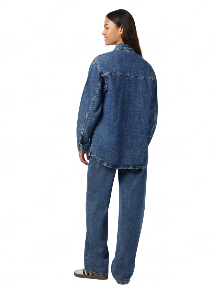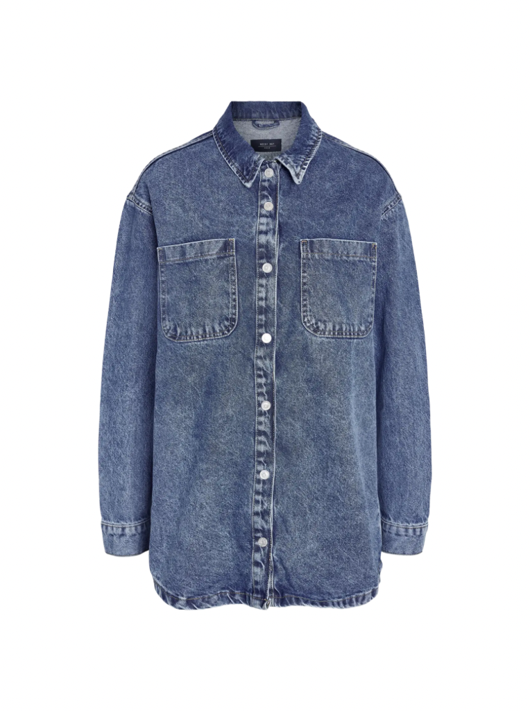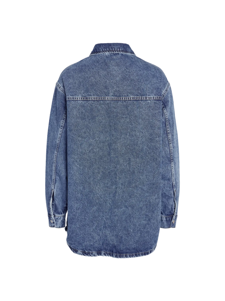 An oversized denim Shacket in a dark/medium wash denim. Featuring snap