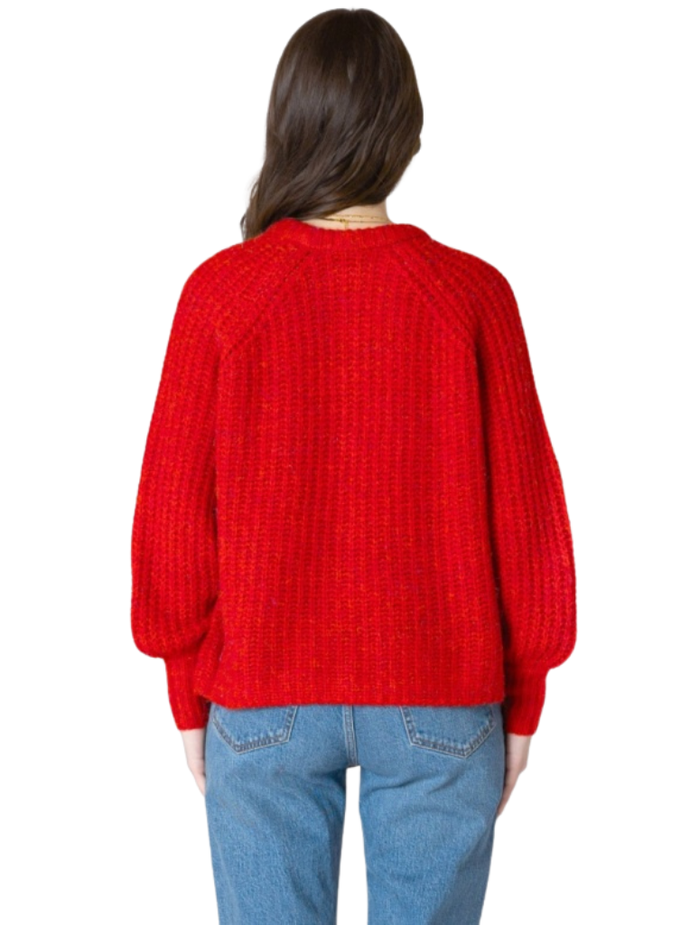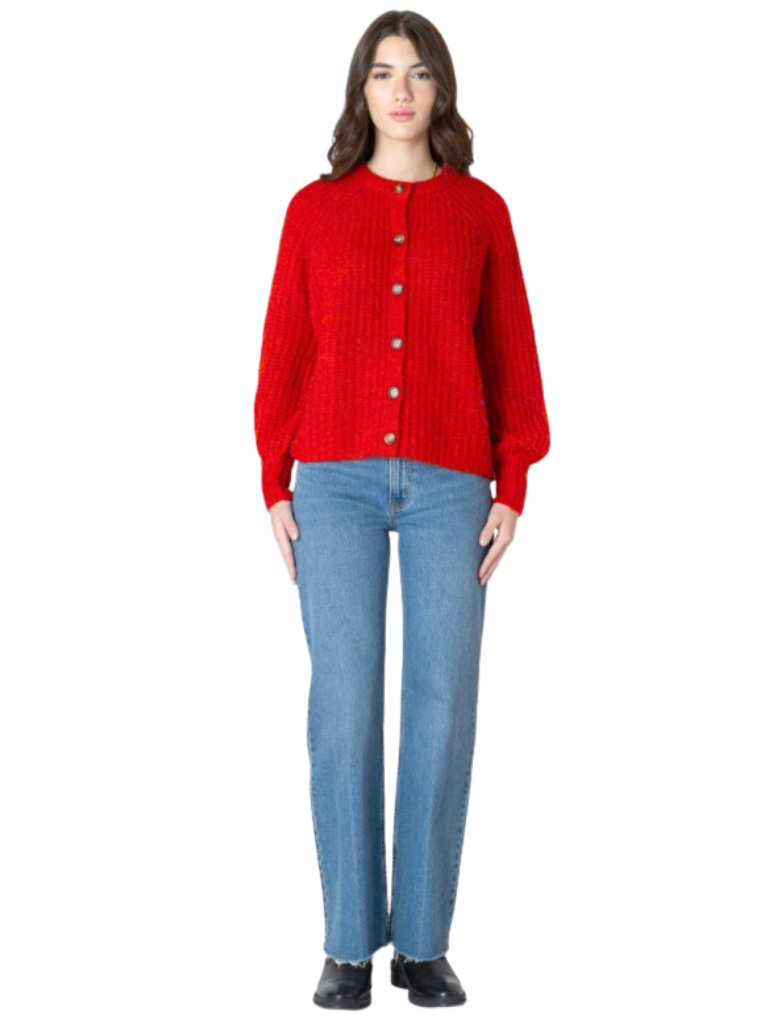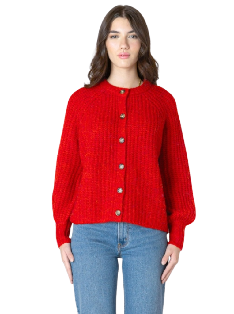 A bright red button up sweater, super cozy with multicoloured thread details like confetti throughout the garment. Perfect for the holiday season.