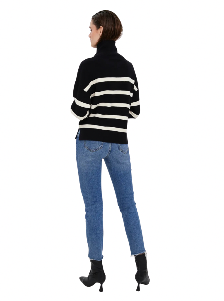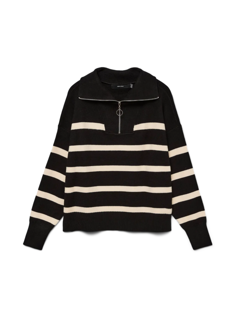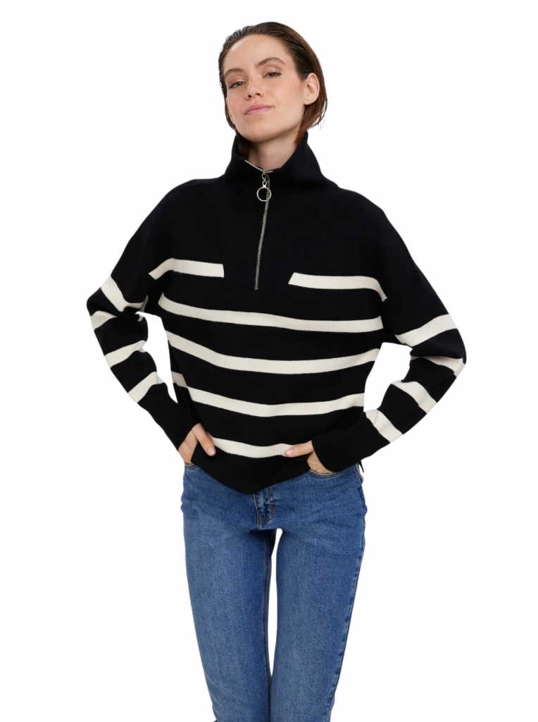 A striped, quarter zip sweater, with a convertible neckline for a collared look or a funnel neck.