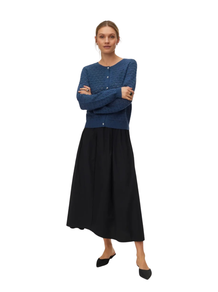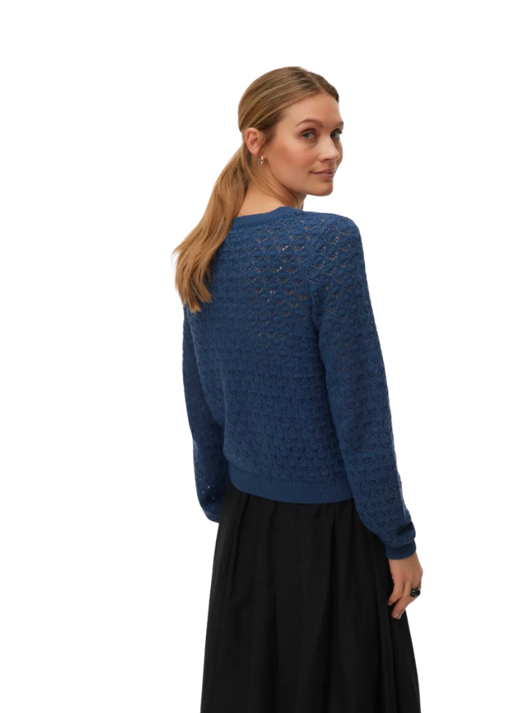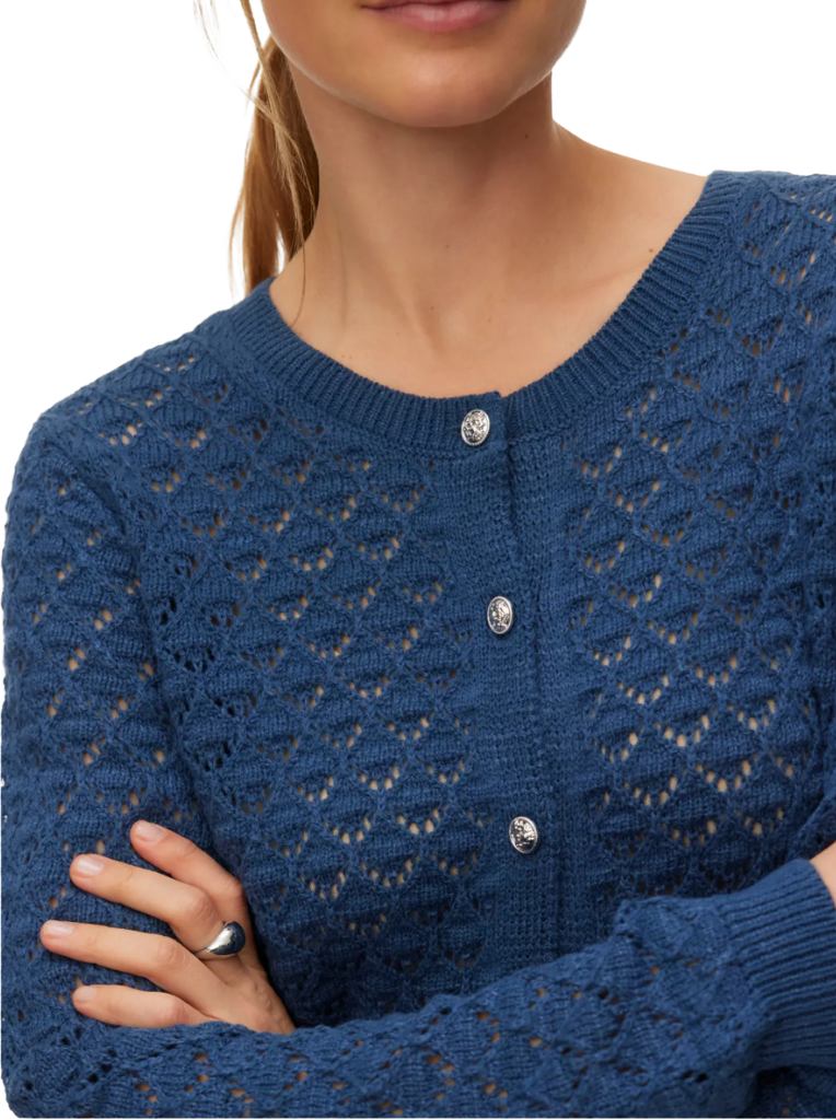 An ocean blue coloured knit cardigan with a silver button front closure. Wear as a twin set with the Jacqueline sleeveless top underneath!
